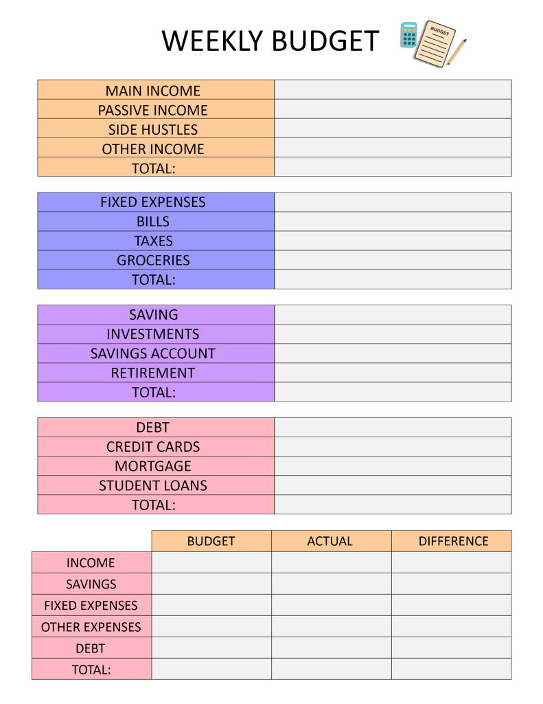- Be Consistent: Make it a habit to fill out your template at the beginning of each week and update it regularly as you spend money.